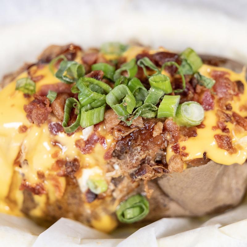 Baked potato smothered in sour cream, pulled pork, Bourbon BBQ, bacon and melted cheese